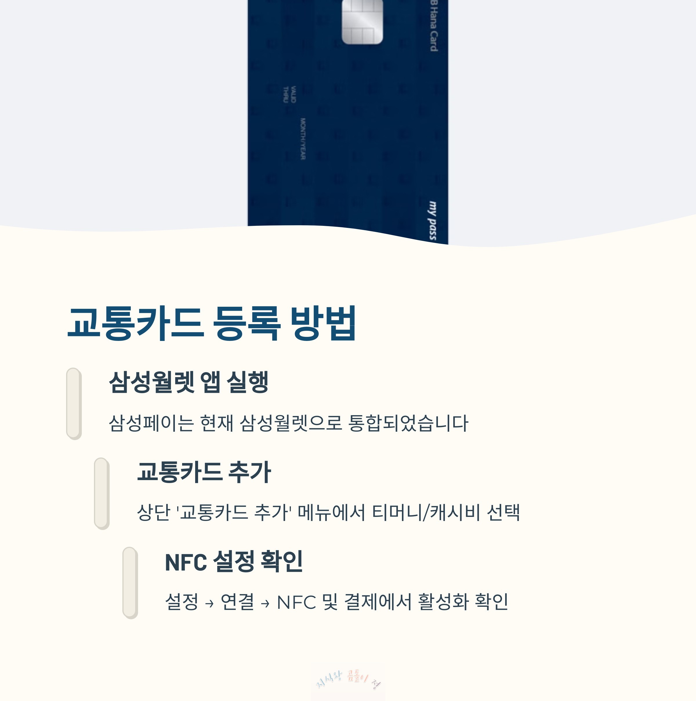 - 삼성월렛에서 교통카드를 추가하고 NFC 설정을 활성화하면 등록 완료.
