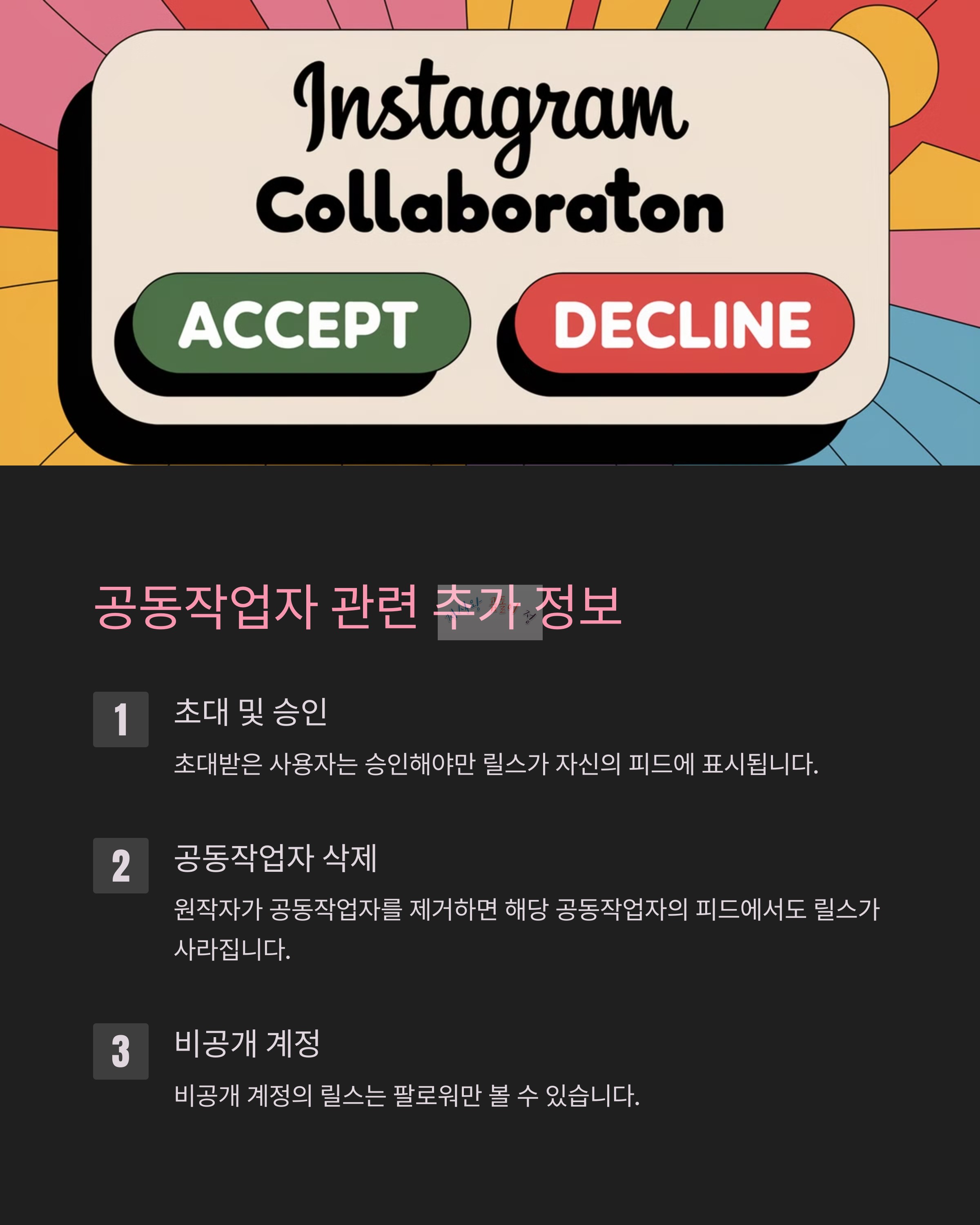 - 초대받은 사용자는 해당 초대를 승인해야만 릴스가 자신의 피드에 표시됩니다.