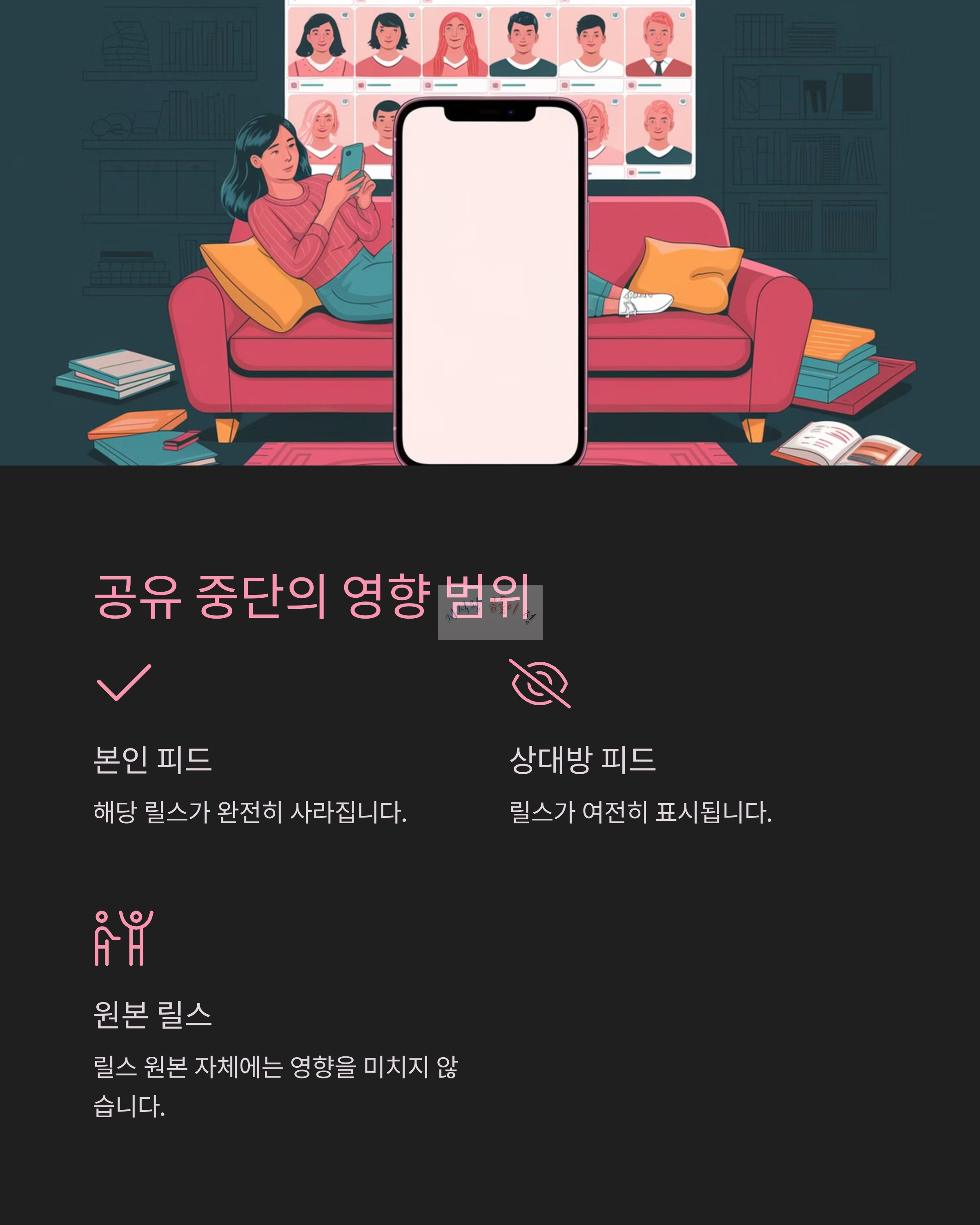 - '공유 중단' 옵션을 선택하면 해당 릴스가 자신의 피드에서 사라집니다.