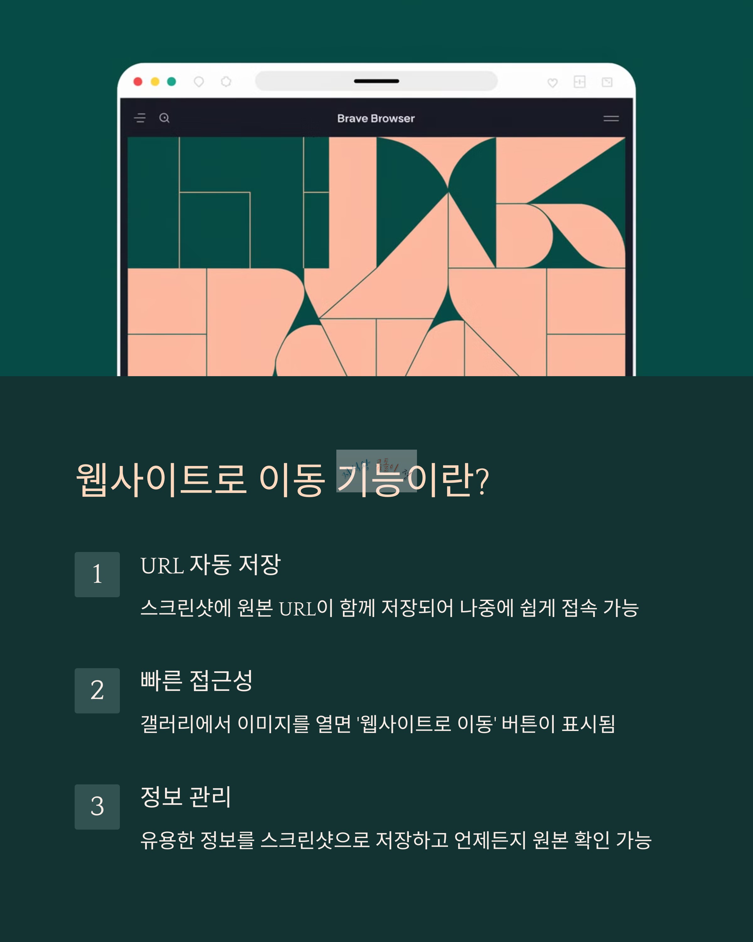 - 브레이브 브라우저에서 스크린샷에 URL 정보를 추가하는 기능을 활성화하면 '웹사이트로 이동' 버튼을 통해 해당 사이트로 빠르게 접속할 수 있습니다.