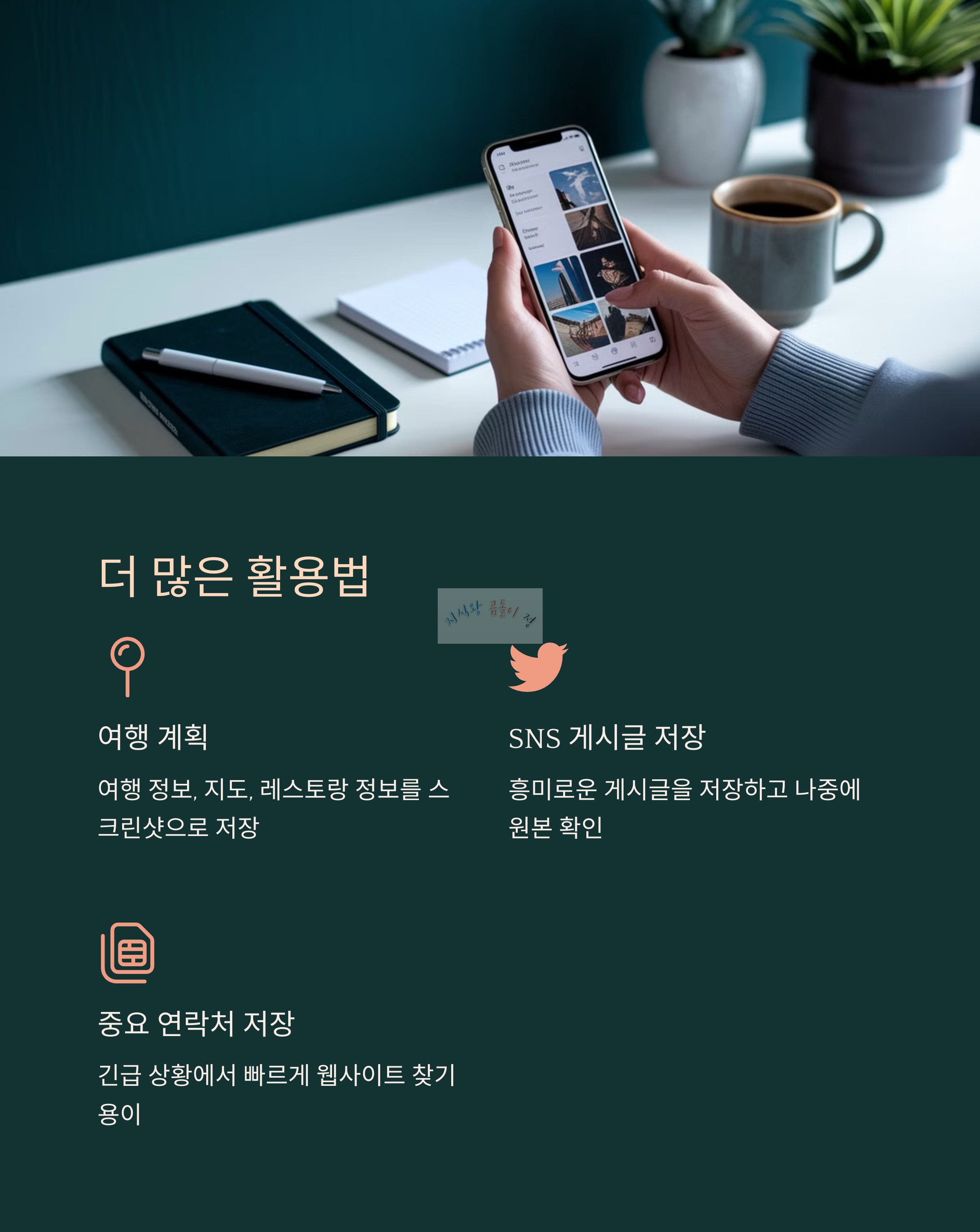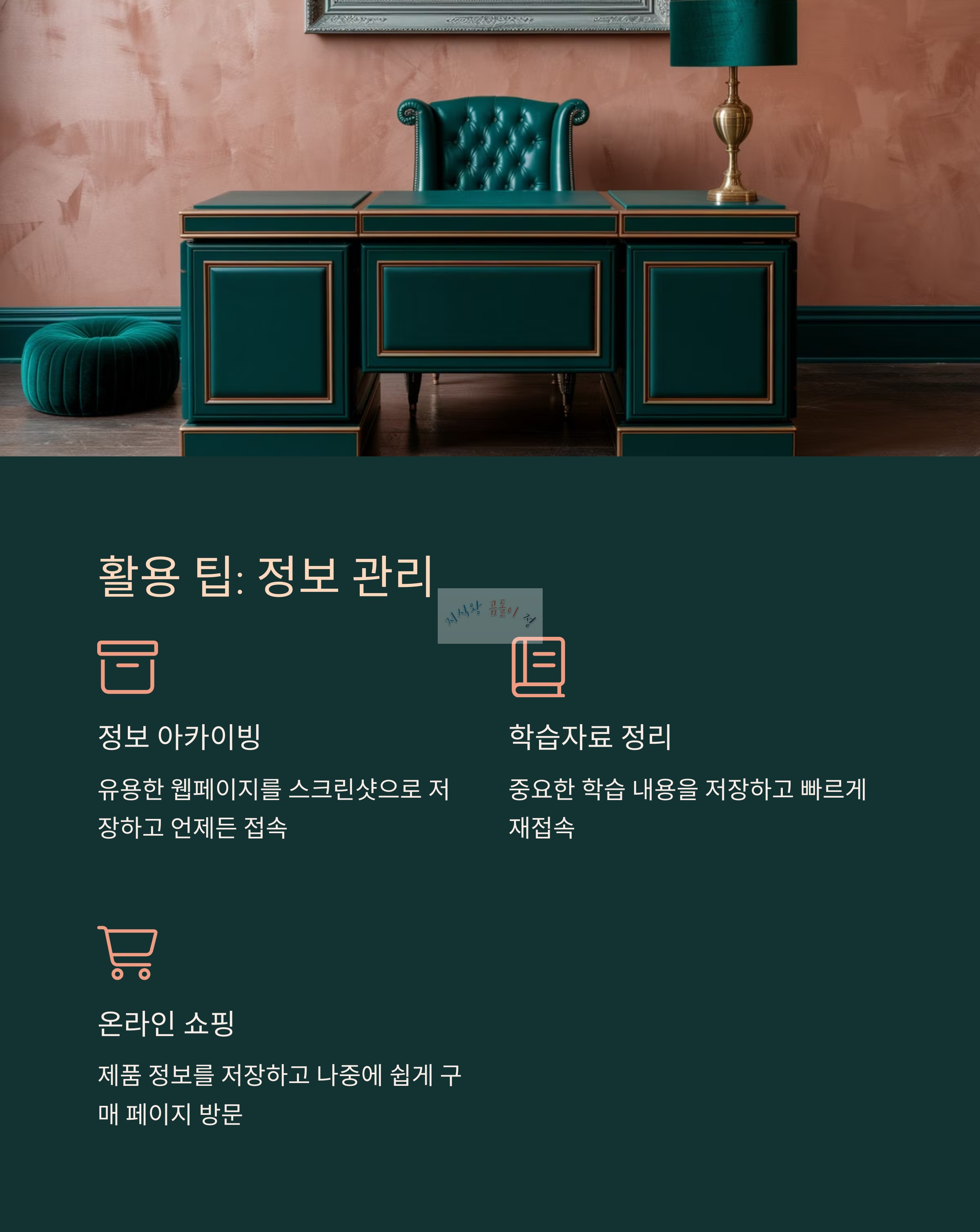 - 정보 아카이빙: 유용한 정보가 담긴 웹페이지를 스크린샷으로 정리하고, 나중에 바로 해당 페이지로 접속할 수 있습니다.