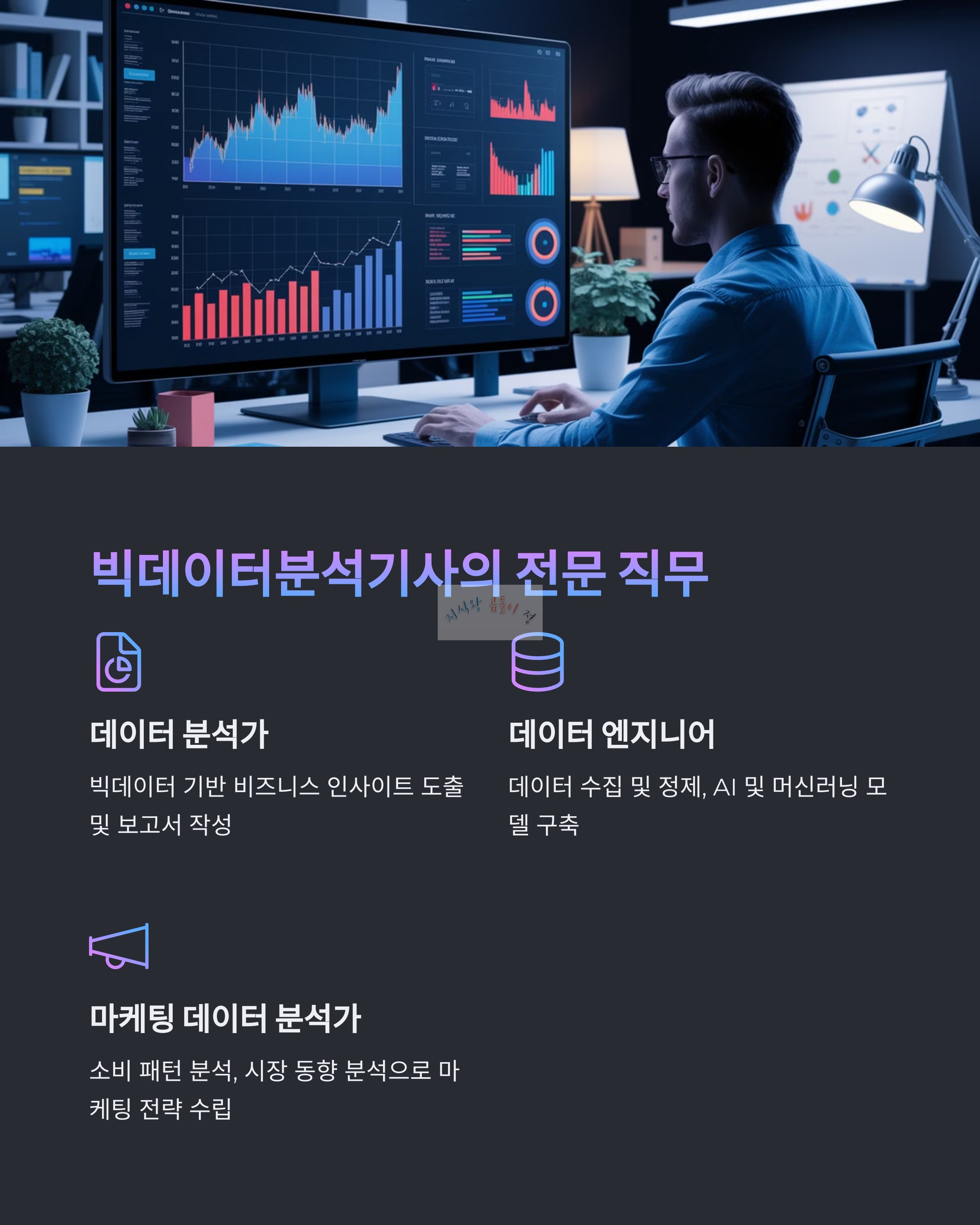 - 데이터 분석가: 빅데이터를 기반으로 비즈니스 인사이트 도출 및 보고서 작성