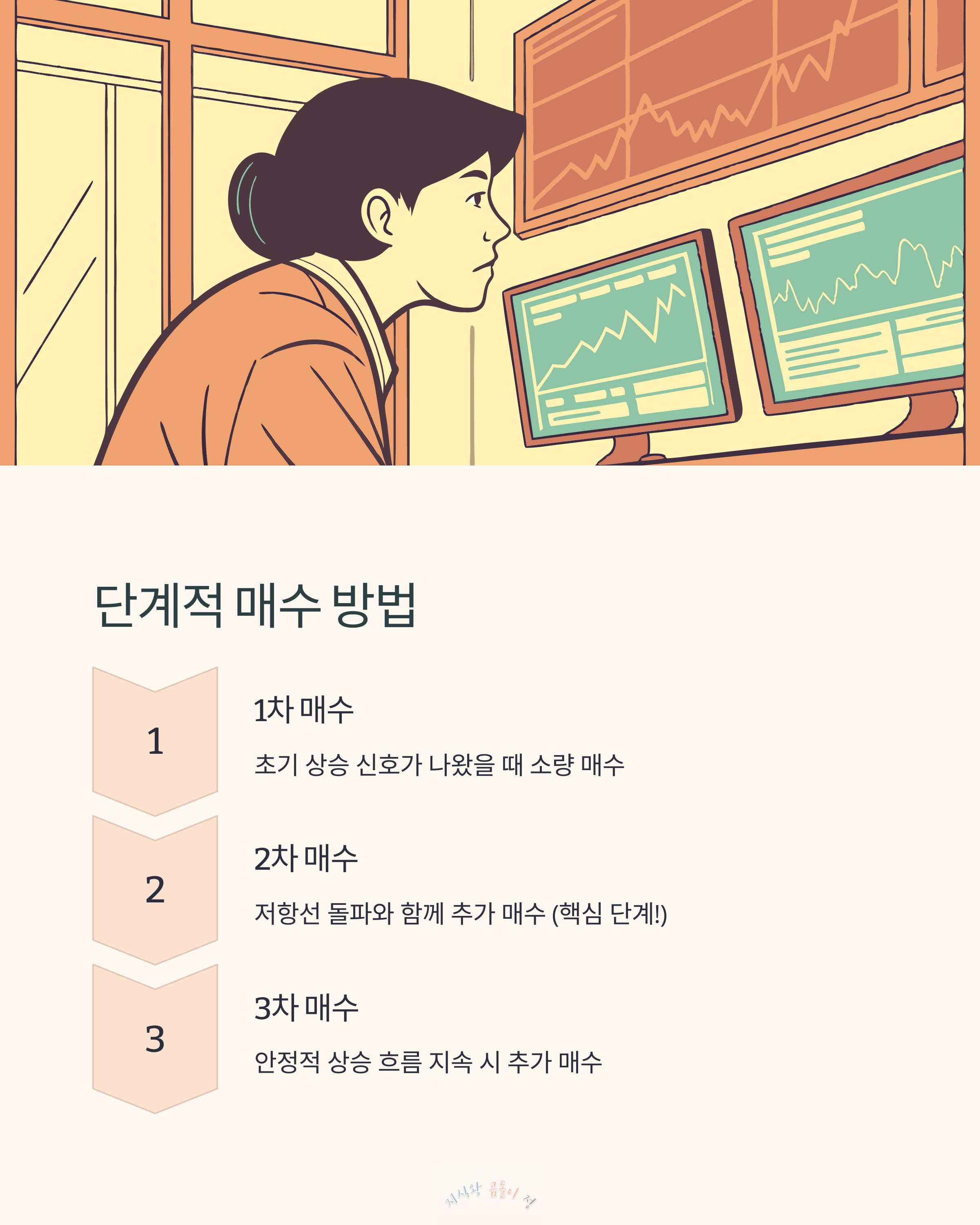 - 2차 매수: 저항선 돌파와 함께 추가 매수 (이 시점이 핵심!)