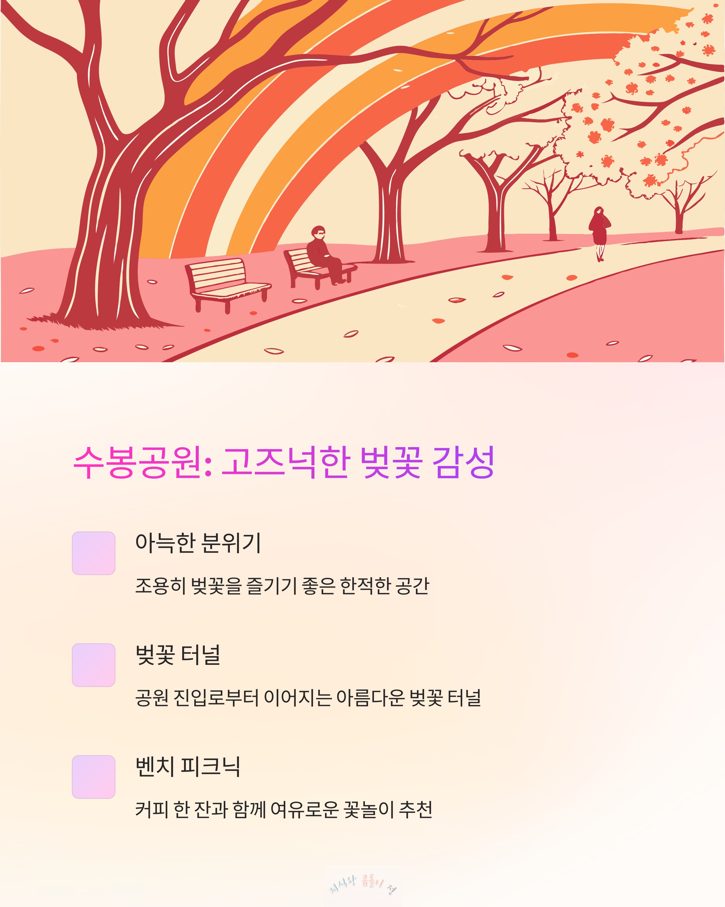 수봉공원은 아늑하고 고즈넉한 벚꽃 명소로, 사람들로 북적이는 곳보다는 조용히 벚꽃을 즐기고 싶은 분들께 추천해요.