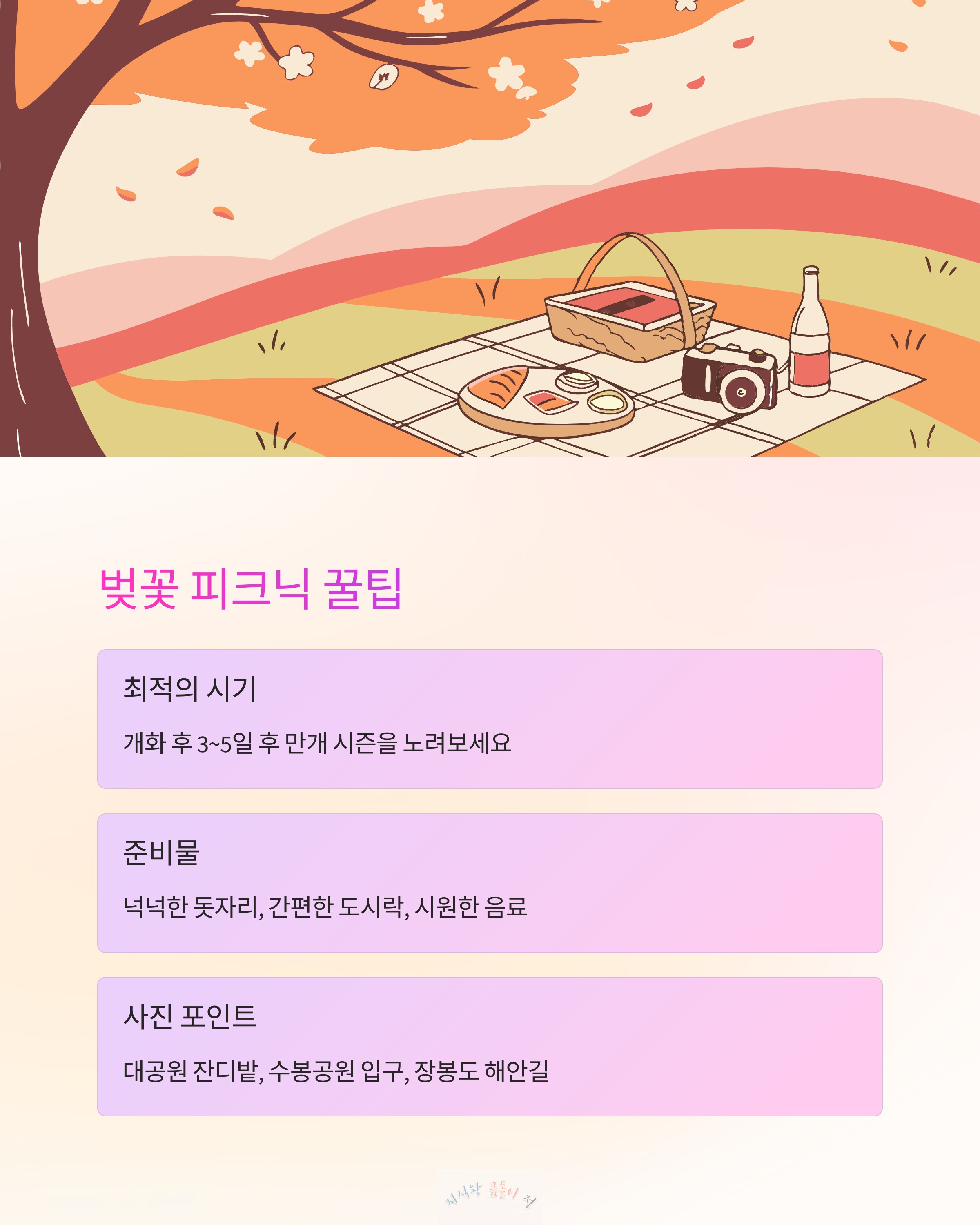 - 음료 & 디저트: 봄날에 어울리는 시원한 음료와 과일을 챙기면 좋아요.