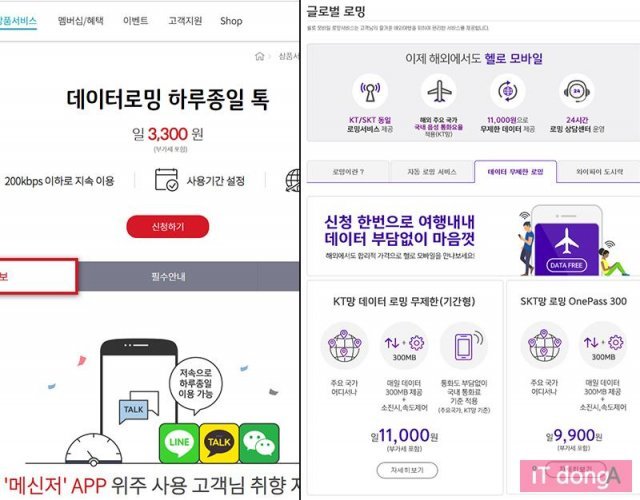 주요 국내 이동통신사의 로밍 요금 비교