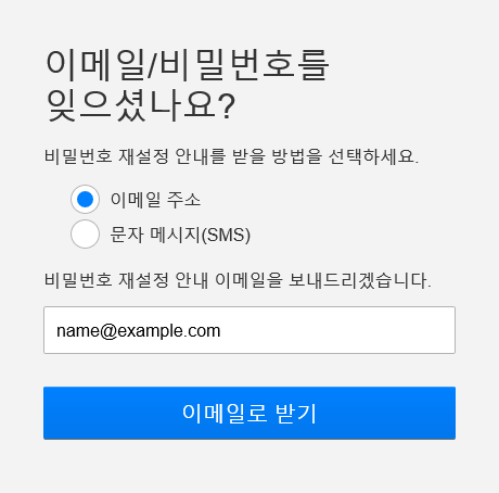- 이메일 주소 또는 전화번호 선택 : '이메일 주소나 전화번호를 기억할 수 없어요'를 선택하세요.