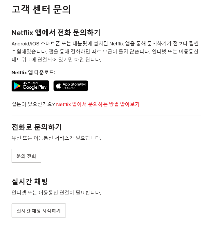 - 앱을 통한 문의 : 넷플릭스 앱을 통해 고객 지원에 문의할 수 있어요. 앱에서 '고객 지원' 메뉴를 찾아보세요.