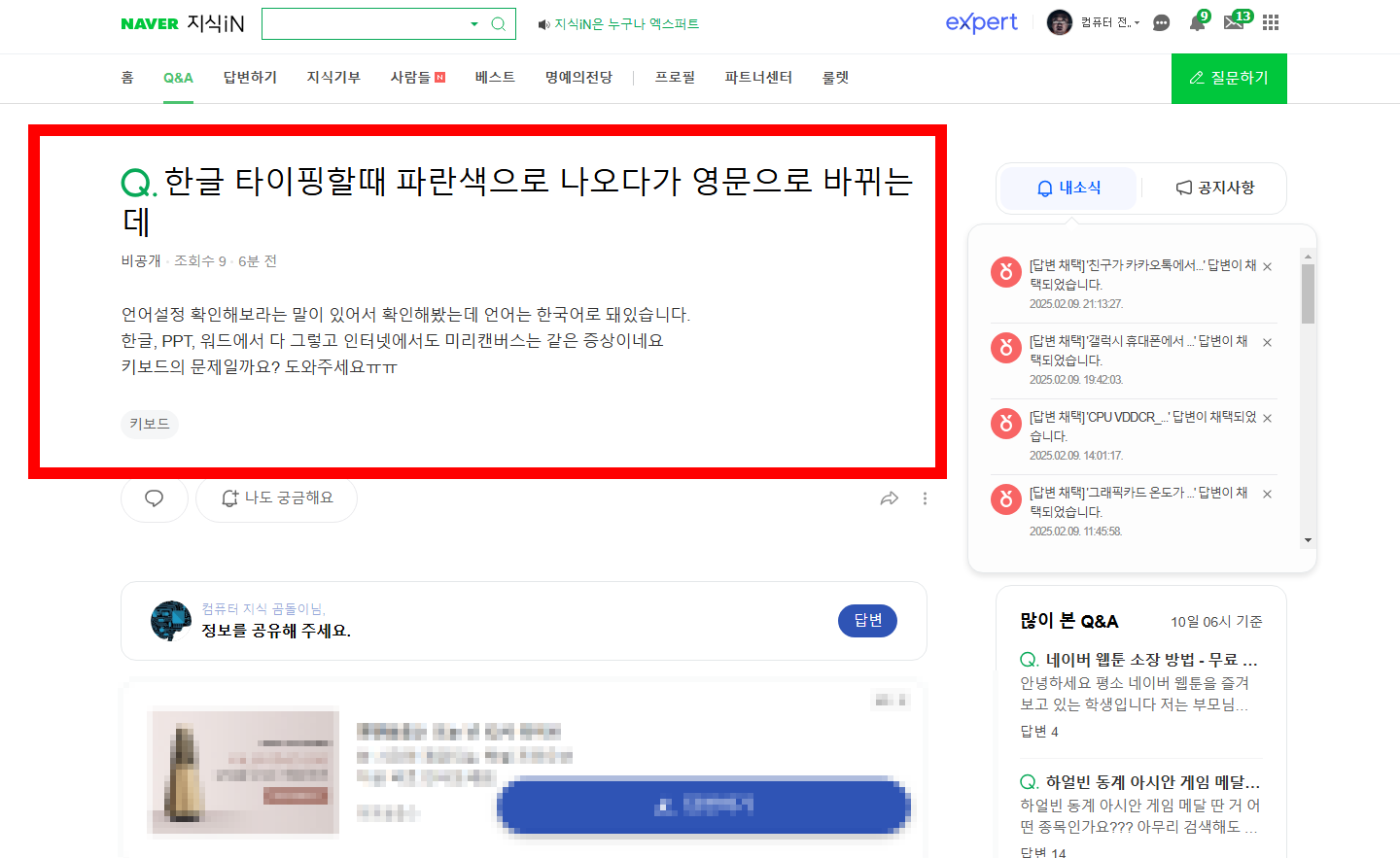 한글 타이핑 시 파란색으로 변하고 영문으로 바뀌는 문제 해결 방법